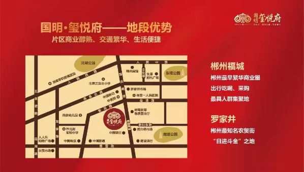 地段:位于最繁华的国庆南路,老城区的中芯位置罗家井斜对面,步行约5分钟是文化路,步行约7分钟是步行街、步步高新天地商场。教育:项目约500米拥有15年一站式教育,周边多个公私立幼儿园,步行约5分钟到郴州名列前茅的北湖实验学校(与本楼盘一路之隔)九年一站式教育免去接送孩子的烦恼。配套:市中芯周边菜市场、商业云集,立体交通,公交环绕。环境:打造市中心纯住宅高端大盘,在商业云集寸土寸金的市中心,纯住宅花园小区就像一股清流带来甘甜可口。自带约1万多方私家车花园,可供老人孩子尽情散步玩耍。